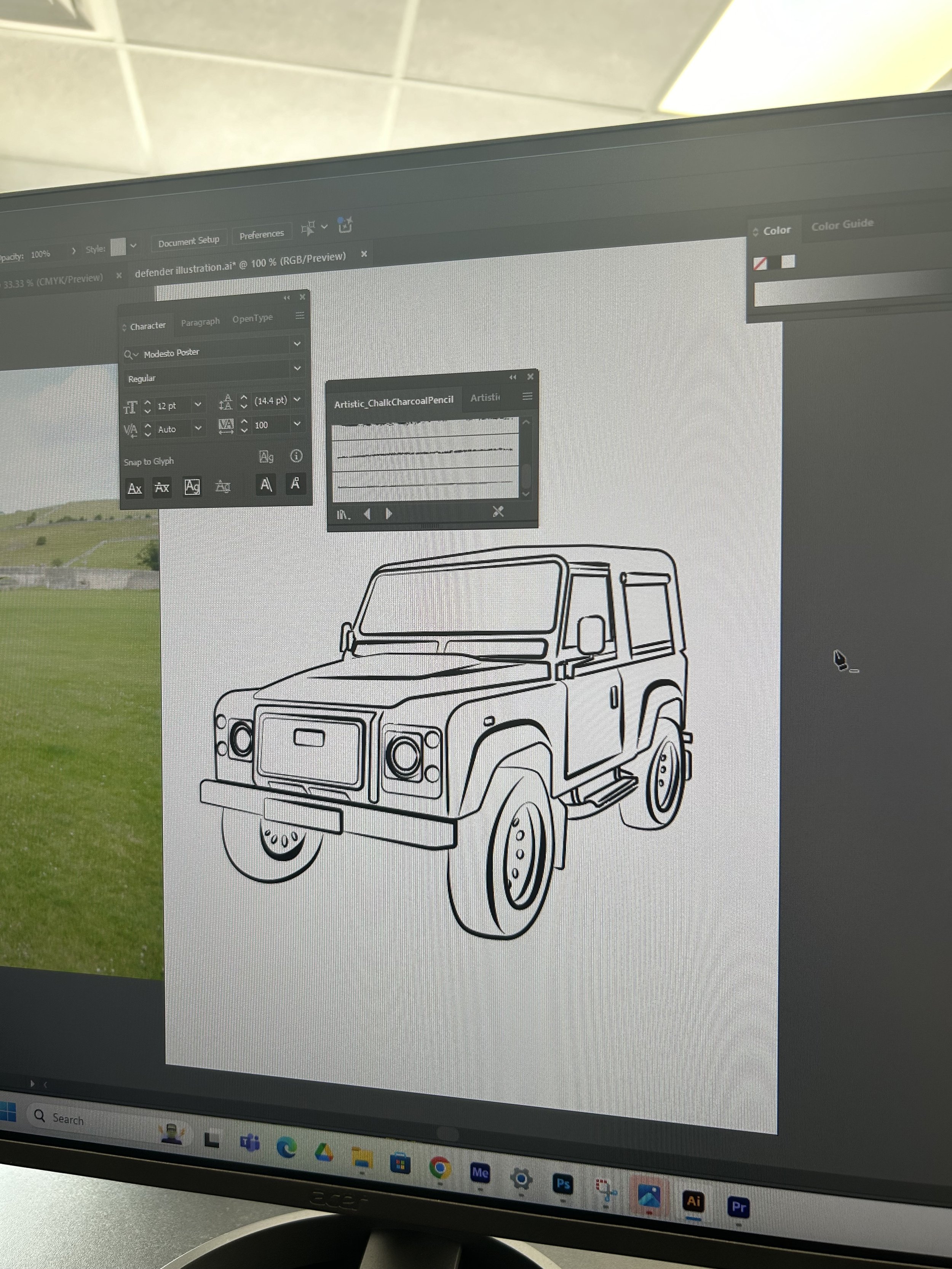 A huge aspect that the boss’ wanted to get across was the heritage and uses of the original LandRover Defender. These initial sketches all included the vehicle in-situ - with mountainous backgrounds and a winding road to reflect the adventurous and ‘epic’ spirit of the car.